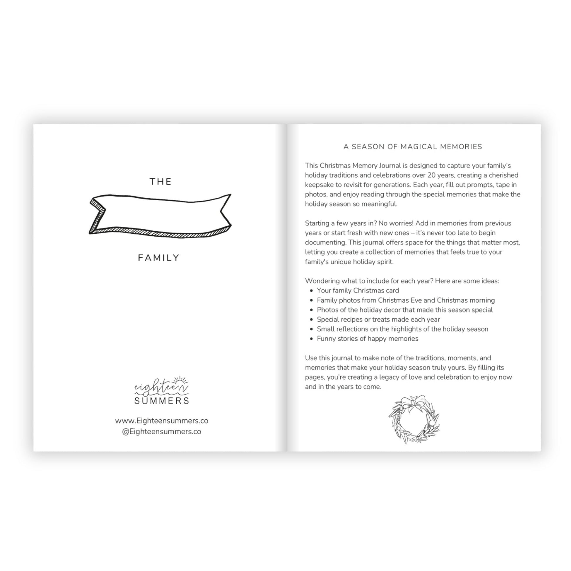 Capture the spirit of your family’s holiday traditions with our Christmas Memory Journal, designed to document 20 years of joyful celebrations. This keepsake is perfect for revisiting each year, preserving memories that become part of your family’s holiday legacy.