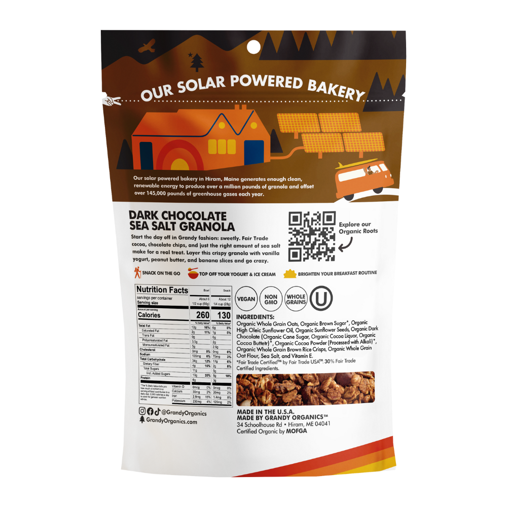 Start the day off in Grandy fashion: sweetly. Fair Trade cocoa, chocolate chips, and just the right amount of sea salt make for a real treat. Layer this crispy granola with vanilla yogurt, peanut butter, and banana slices and go crazy.