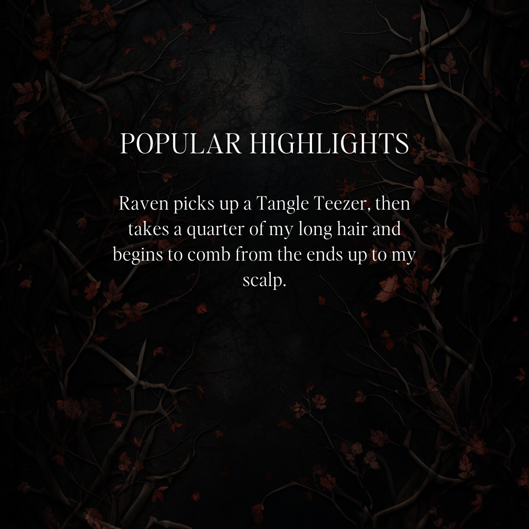 He grabs my hips, pushing me back on his cock, fucking me harder, deeper. He’s brutal, untamed, and it drives me crazy. Raven puts his hand in my hair and pushes on my head until my chest is on the ground. Then he growls, squats behind me, and rams back inside of me over and over again. I grab onto the dirt, sticks, leaves. A twig scrapes against my chest, and I don’t care as long as Raven doesn’t stop.