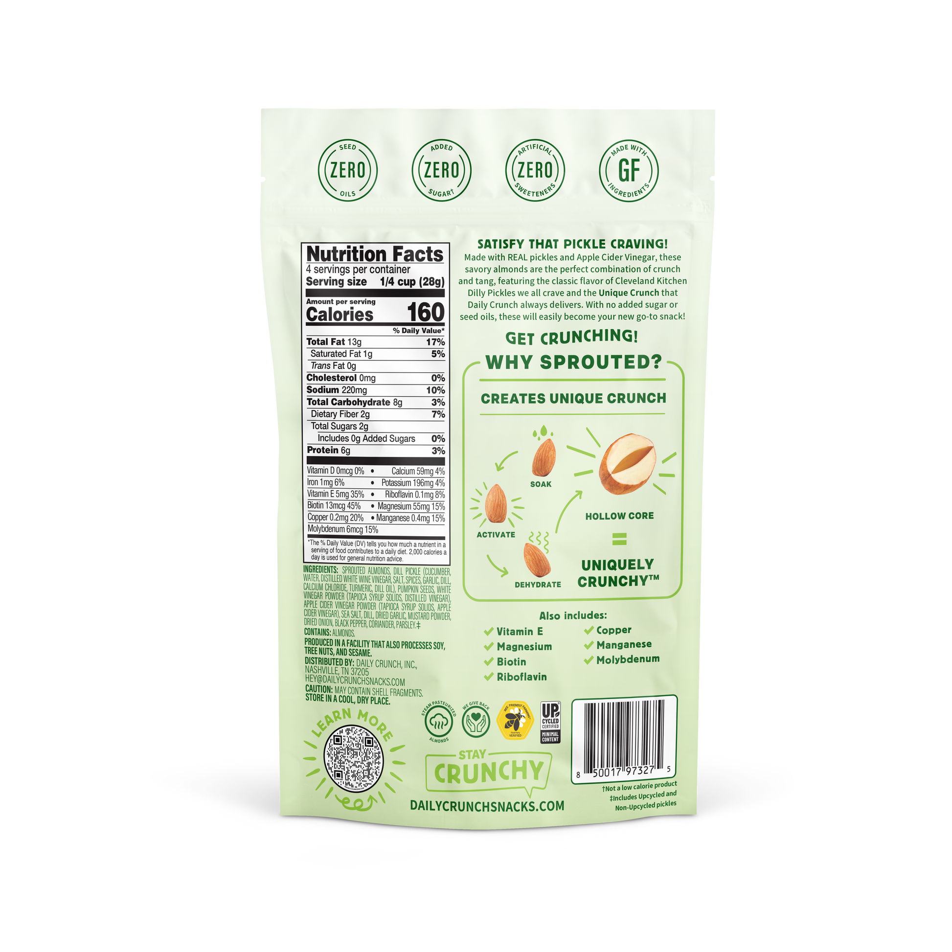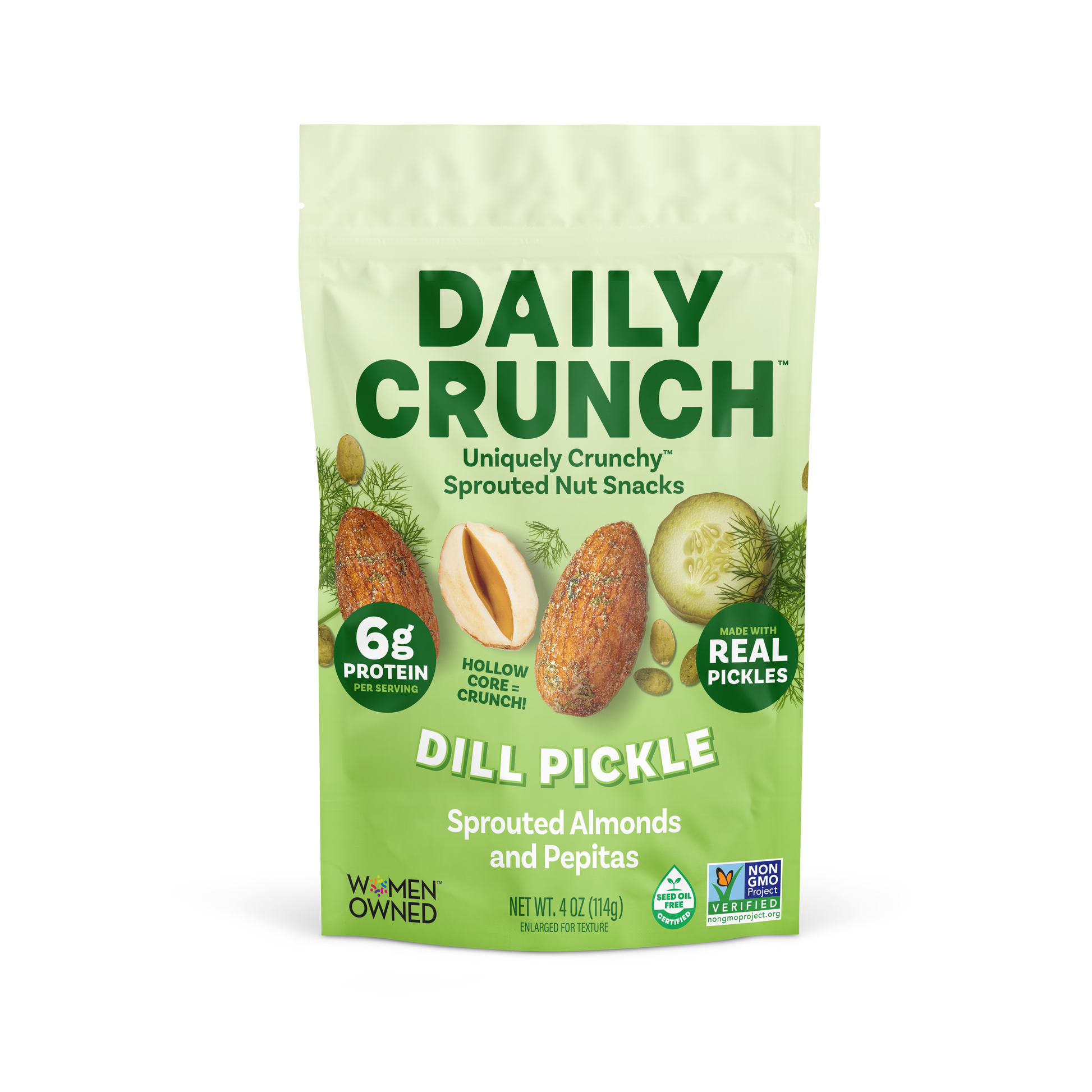 SATISFY THAT PICKLE CRAVING! Made with REAL dried pickle crisps and apple cider vinegar, these savory almonds are the perfect combination of crunch and tang, featuring the classic flavor of dill pickles we all crave and the Unique Crunch that Daily Crunch always delivers.