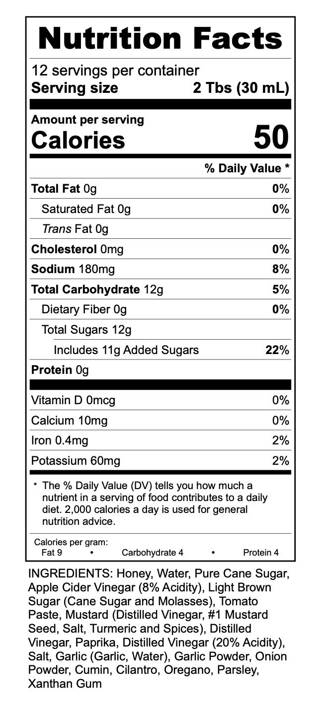 Ingredients: Honey, Water, Pure Cane Sugar, Apple Cider Vinegar (8% Acidity), Light Brown Sugar (Cane Sugar and Molasses), Tomato Paste, Mustard (Distilled Vinegar, #1 Mustard Seed, Salt, Turmeric and Spices), Distilled Vinegar, Paprika, Distilled Vinegar (20% Acidity), Salt, Garlic (Garlic, Water) Garlic Powder, Onion Powder, Cumin, Cilantro, Oregano, Parsley, Xantham Gum