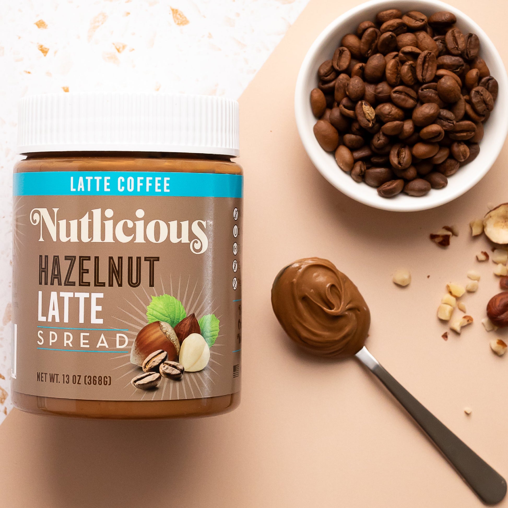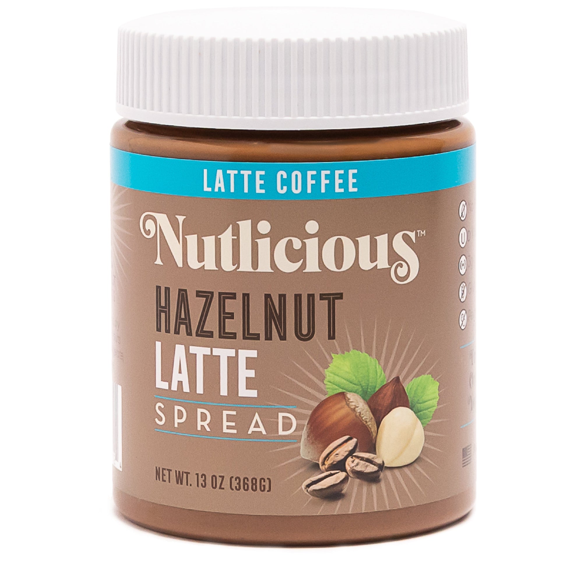 Hazelnut Latte Spread (13 oz), Nutlicious, Spreadable Roasted Hazelnuts Infused with Rich Coffee, Made in the USA, No Palm Oil, 3g of Protein.