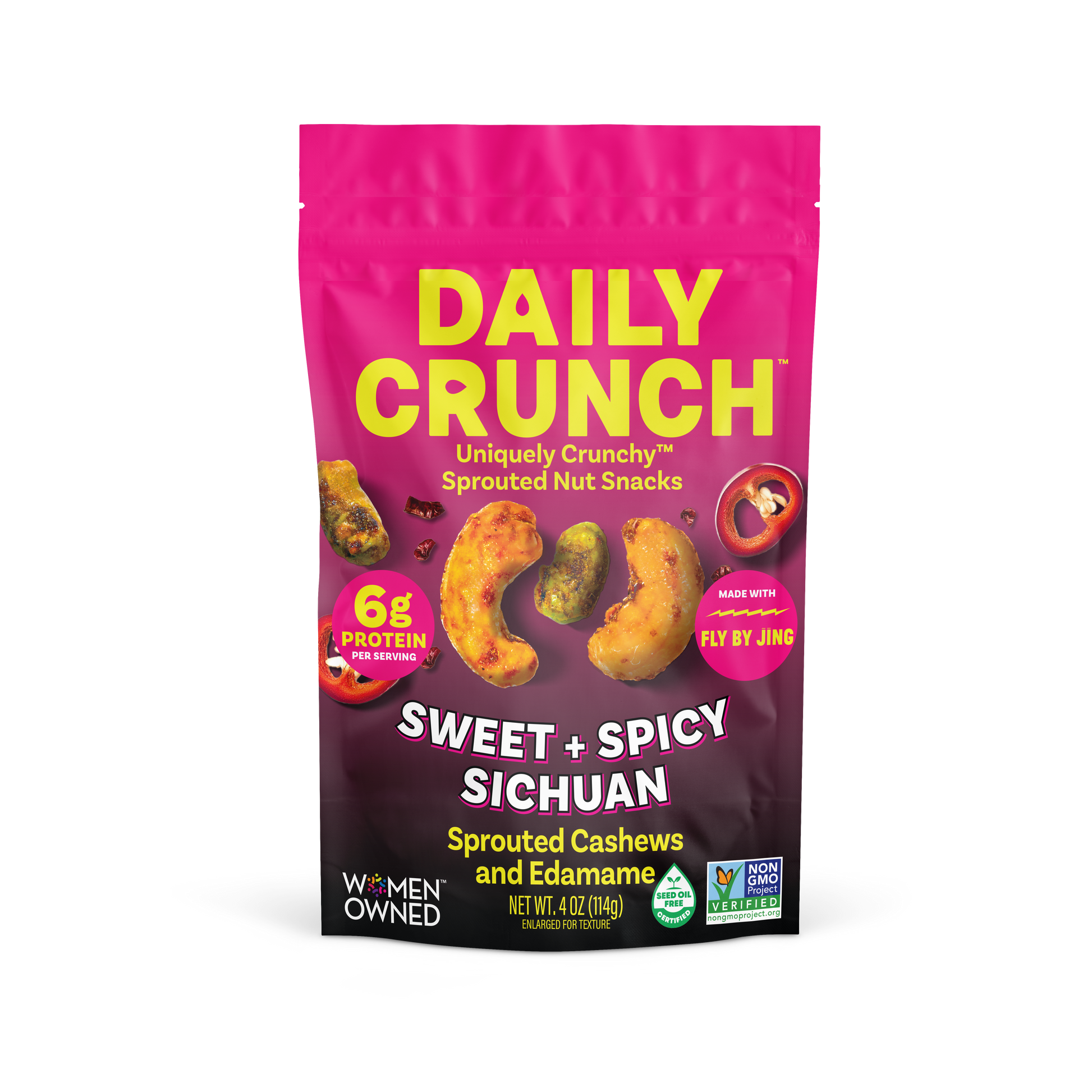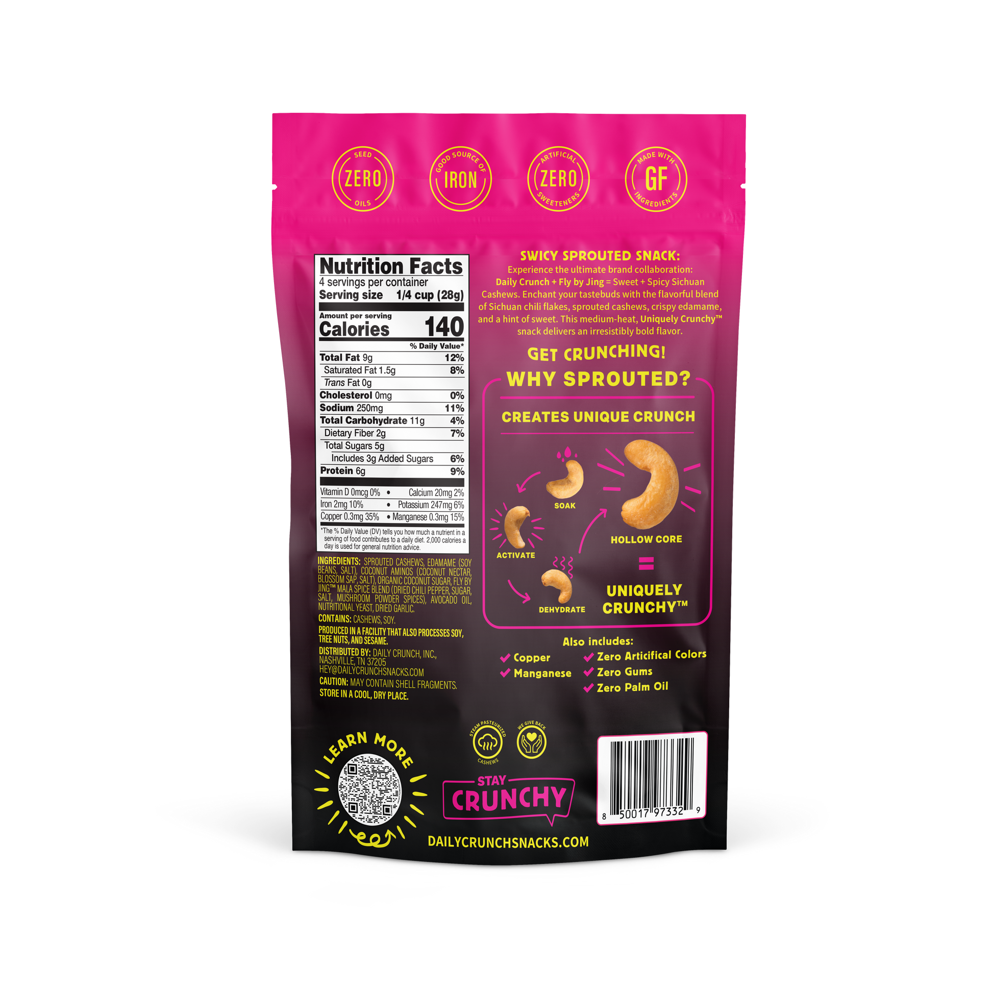 SWICY SPROUTED SNACK: Experience the ultimate brand collaboration: Daily Crunch + Fly by Jing = Sweet + Spicy Sichuan Cashews. Enchant your tastebuds with the flavorful blend of Sichuan chili flakes, sprouted cashews, crispy edamame, and a hint of sweet. This medium-heat, Uniquely Crunchy™ snack delivers an irresistibly bold flavor. Get Crunching!