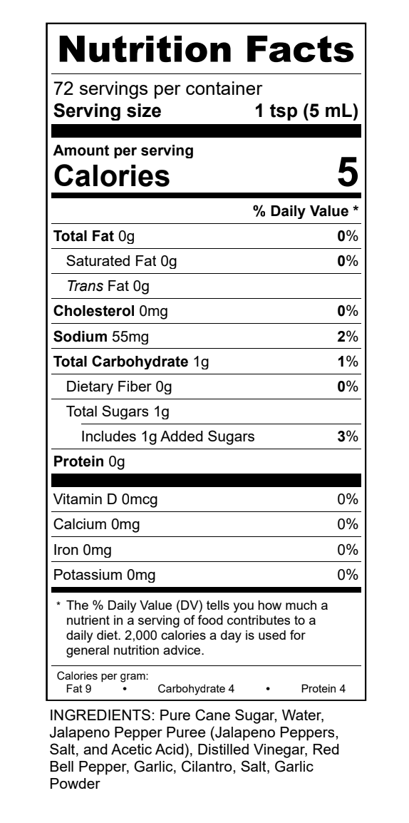 INGREDIENTS: Pure Cane Sugar, Water, Jalapeno Pepper Puree (Jalapeno Peppers, Salt, and Acetic Acid), Distilled Vinegar, Red Bell Pepper, Garlic, Cilantro, Salt, Garlic Powder